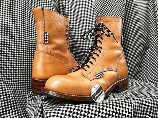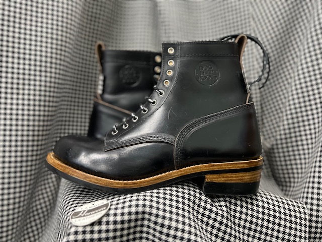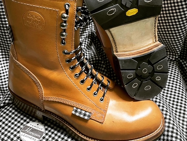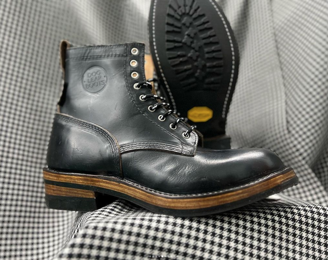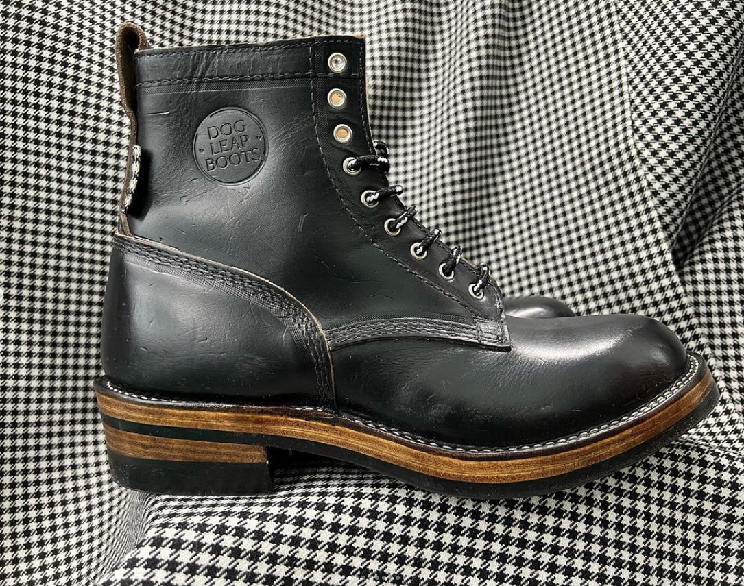 All our Chillingham Dog Leap boots are leather lined, leather insole at the heart of the boot soaked in our tyne river water and shaped to the last. Leather heel stiffeners and toepuffs also soaked first and individually skived. Triple leather middles. Outsole stitched. Bellows padded tongue. Leather and poron shock absorbant insoles. Black and white and leather laces.